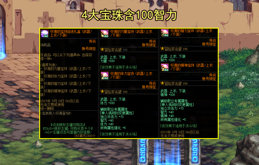 怀清宝珠自选礼盒方面,可以在100力/体/精/智这4种宝珠选择一种,部位为武器、上衣、下装。其中奶妈和奶萝成为了本次活动的最大赢家,100智力附魔到目前为止都是奶妈、奶萝这3个部位的毕业附魔,由于产量少的关系,拍卖售价高达3000万金币,非常的昂贵,这对于有买想法的玩家无疑是省了3000万 ,而对于买不起的玩家来说也是美滋滋,不过送1个未免太寒碜了一些。