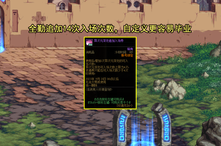 其中异次元深处追加入场券可增加1次“自定义之路”入场次数,每天可兑换1张,也就是说总共可换14张,14张票的赠送对于玩家获得自定义,以及未知异次元碎片有很大有一定的帮助,特别是对于可以打“异次元之路”角色比较少的玩家来说,可以兑换到更多的道具。