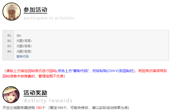 在昨天论坛上新出现了第二期招募天空之城体验服的帖子,那么这一次大家就别错过了,招募的的时间2018年12月21号20点 - 2018年12月22日18点,在晚上8点更新招募活动的帖子,大家需要回答3个问题,且要在规定的名额内提交,那么就能获得本次招募的机会。