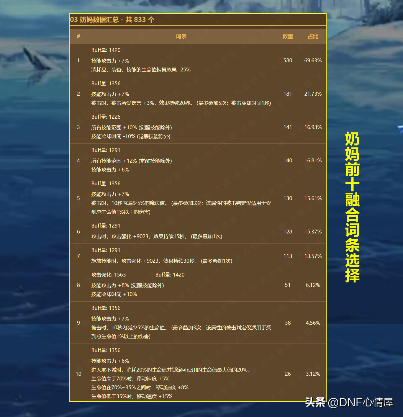【1】奶爸贴膜词条前十汇总。 “技能攻击力+7%,消耗品、装备、技能的生命值恢复效果减少25%”,buff量为1420,属于最高的存在,数量占比最多。其次是“技功7%,被击伤害+3%”,在buff量上为1356,比排名第一的,要稍微差了一点点。这两个在抽调的玩家中,是选择最多的,而第3~第10,都有人选择,只是数量占比少。