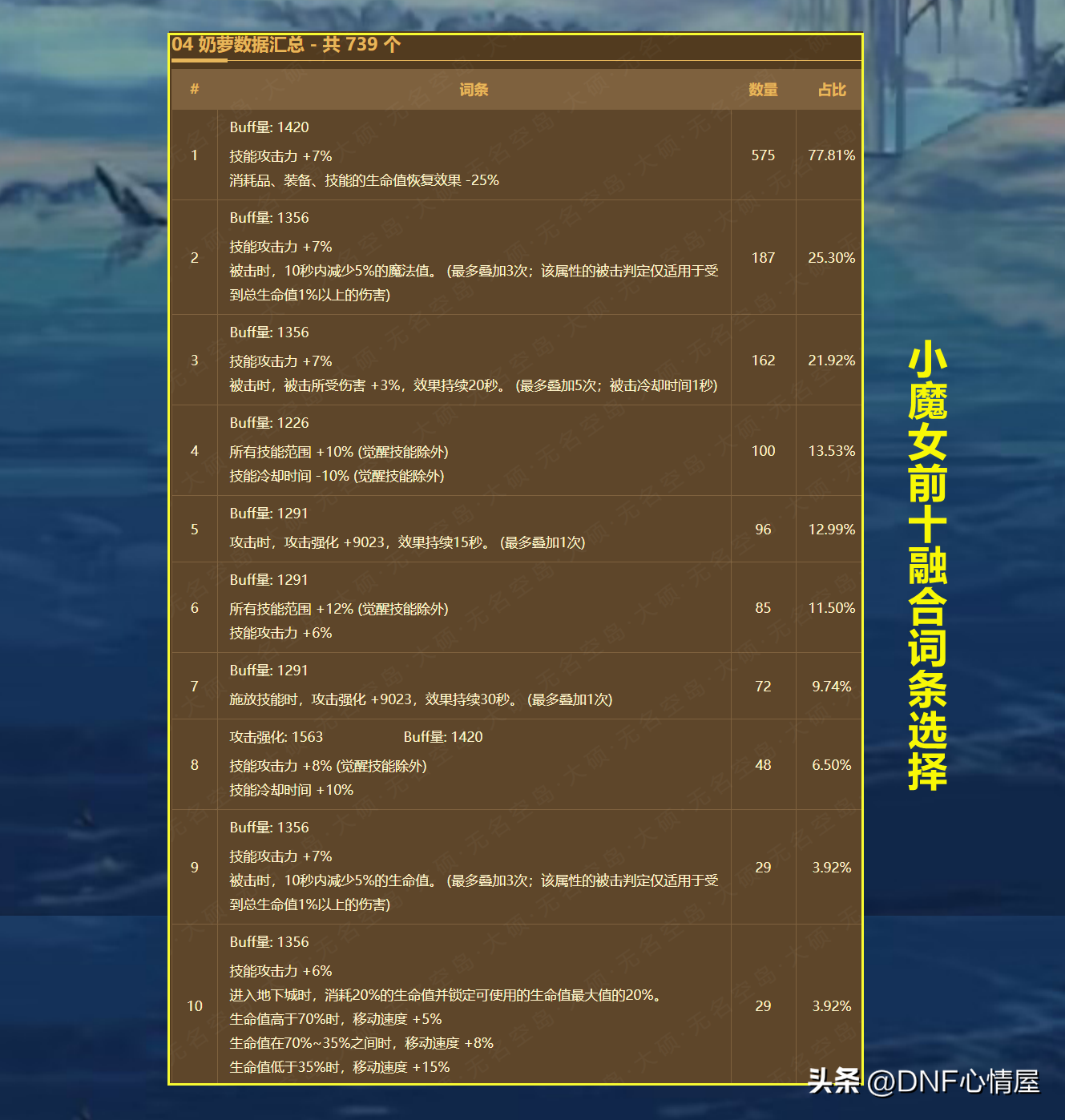 【3】小魔女贴膜词条前十汇总。 从奶萝融合武器,贴膜词条来看,其实跟炽天使,大体上来说,没有啥区别,第1~10的数量占比,都是相差无几。