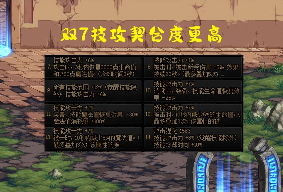 相对来说,7技攻提升就小了一些,但同时,7技攻的限制条件也相对宽泛,而且可选7技攻的词条有多个,适合不同流派玩家,比如增加被击伤害、减少装备恢复效果、减少技能恢复效果等,这些限制条件应该都是很容易接受的。
