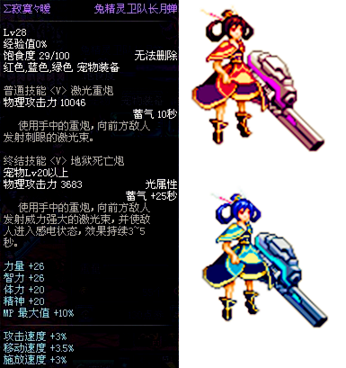 兔精灵宠物是2011年春节套的宠物,也是DNF的第一个人形宠物。它的终极技能和枪炮师的激光炮一样,而且这只人形宠物也不小,做工也是非常精美,只是这套包含宠物的春节套价格应该也是DNF中最贵的一套礼包了。