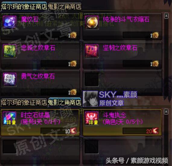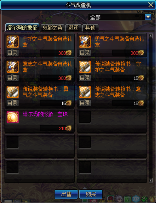 [塔尔玛的象征] 用于兑换对斗气装备进行改造、升级、赋予套装属性时需要用到的材料,不同操作需要的材料不同,但都是用塔尔玛的象征兑换的,所以在获得足够的装备后,就需要累积更多数量的塔尔玛象征来对装备进行打造。[鬼影的破碎之角] 用于兑换裂缝和深渊的门票,裂缝门票账号一天一次,深渊门票角色一天5次,也算一个蚊子腿的福利。