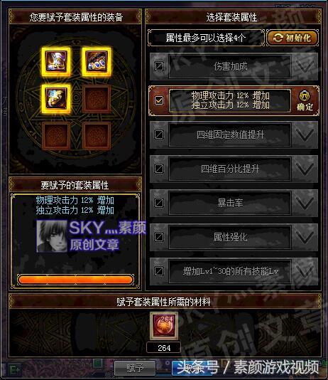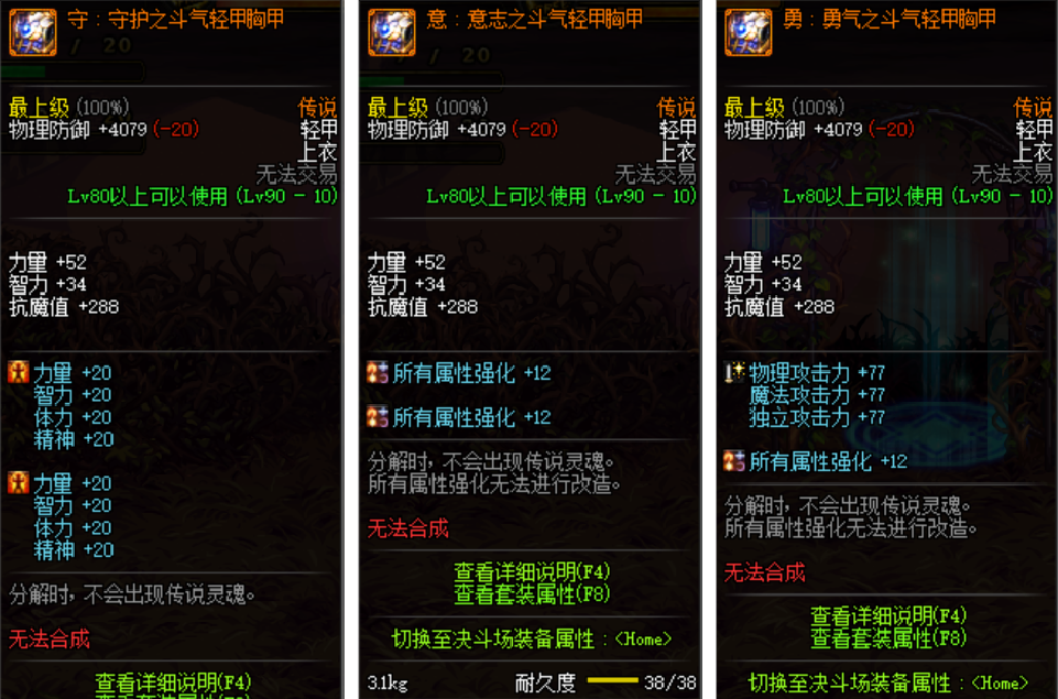 斗气装备一共四个等级:斗、战、狂、灭, 每提升一个等级,装备的现有属性就会得到一定的强化,打造斗气装备最消耗材料的地方是赋予套装属性, 并且对防具来讲,防具类型相同的装备之间才能赋予套装属性,布甲只能和布甲,皮甲只能和皮甲……这里我在赋予三件套装属性时,就需要264个材料,确实比较多,需要坚持每天刷艾副本来累积,同时也不要忘了及时领取[传说地下城探险记]活动的奖励,这个活动对玩家们凑齐一套斗气装备也是有一定帮助的。