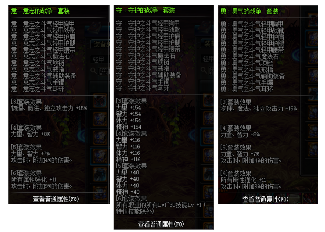 意和勇系列套装属性一样,3件套增加15%的三攻、4件套增加8%的力量和智力,5件增加7%的力智和4%的白字附加,6件套增加11点属强和9%的白字。总体上来说和目前我们的艾肯强度一样。