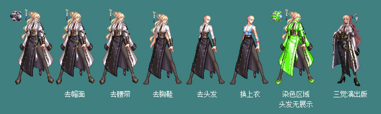 繁复度:★★★★ 还原度:★★★★☆ 熊叔给分:★★★★☆ 优秀散件:披风、头发、上衣 简要短评: 本来这种着重表现面部细节的情况,在服饰上会有一定的削弱,可女机械却交出了一份很不错的答卷 同样也是可以糊弄的部分,她非得给你加量一个机器人宠物,很难说你不用心(同样也是可预知的不带发光层 而帽子部位给了机器人的话,就造成了发型是绑了头饰的,这对于散搭有一定的限制 面部眼镜几乎是无解的问题,在如此小像素的区域里,是很难表现好眼镜的,对发型的配合会要求比较高 原本二觉女机械的职业套就已经很出色了,这次是又赢了一遍,喜获两种披风(蓝猫实名羡慕了 另外裤装是带有裙摆的,尽管里面是黑丝,但是对于散搭的话,限制会比较大