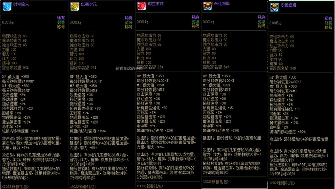 2021、2022年套礼包称号 :年套礼包的称号为每年属性最好的称号,但价格较贵,如果购买,最好是购买带有年套附魔宝珠的称号,技能攻击力+3%