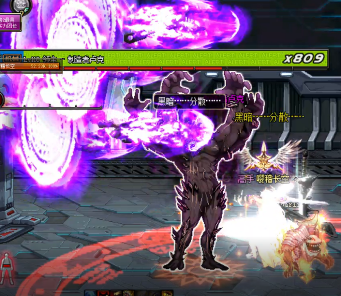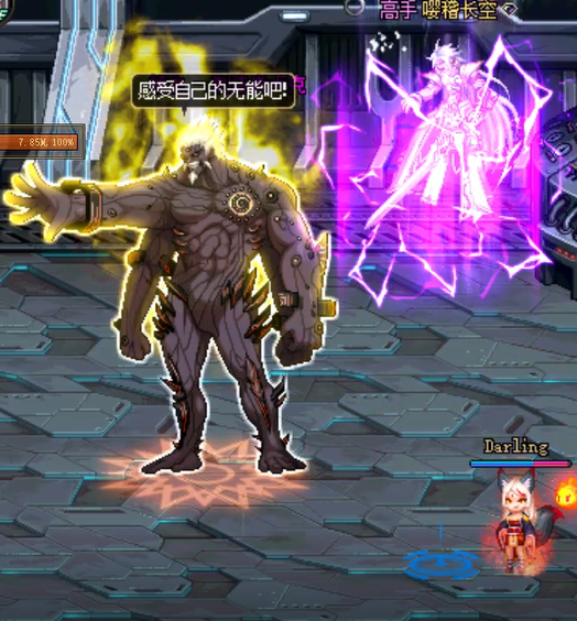 这里分为两种情况,第一种是如上图所示的在暗卢克放禁锢罩子的瞬间我们已经破防,屏幕中间提示黑暗分散,不要犹豫立刻丢二觉,同时开启宠物技能和魔能。