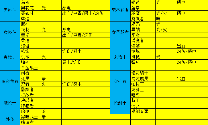 主要是统计了各个职业自带的“属性攻击”以及“异常状态”,其中可能存在缺漏或不足的地方,希望兄弟们多多海涵,有不足的地方也请指正,立马改!