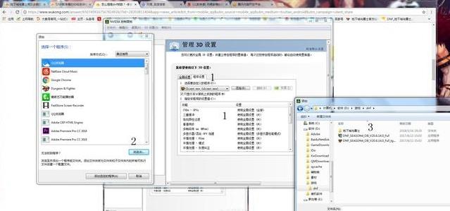 然后右上角选择,3D设置-管理3D设置,然后右边面板,选择程序,在里面找到DNF的文件,一定要是.exe后缀结尾的,否则无效,如图