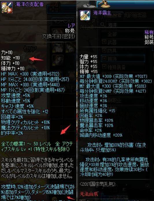 再来看看同款节日套的属性差距,海洋霸主称号在日服四维增加110点,足足是国服的两倍,还有附魔宝珠增加技能等级,除此之外攻击时还能追加12%的白字伤害以及15%的黄字伤害,对比一下国服的海洋霸主称号,直接秒杀成灰,你以为这样就结束了?其实这只是冰山一角。
