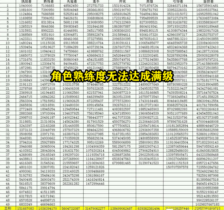 可能很多玩家认为英雄级就是最高级别的熟练度了,但其实英雄熟练度之后,还有引导者、拯救者这两个熟练度级别。而熟练度在英雄之后,更是以几百亿,甚至几千亿经验跨越,以现在一条疲劳皇宫3倍经验计算,一天最多也不过5亿经验,想要达到拯救者49级,哪怕全角色开始刷皇宫,在过10年估计也无法达成。