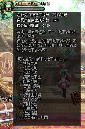 首先每在推荐地下城消耗30点疲劳才会出现1次许愿球,这个许愿球可以爆出普通史诗、祈愿史诗、神话或引导石,这里要注意必须在活动推荐的13个地下城中消耗30点疲劳才算,这13个地下城都是常规地下城,如果小伙伴们刷比较多的周常副本,消耗多少疲劳都是不算数的。