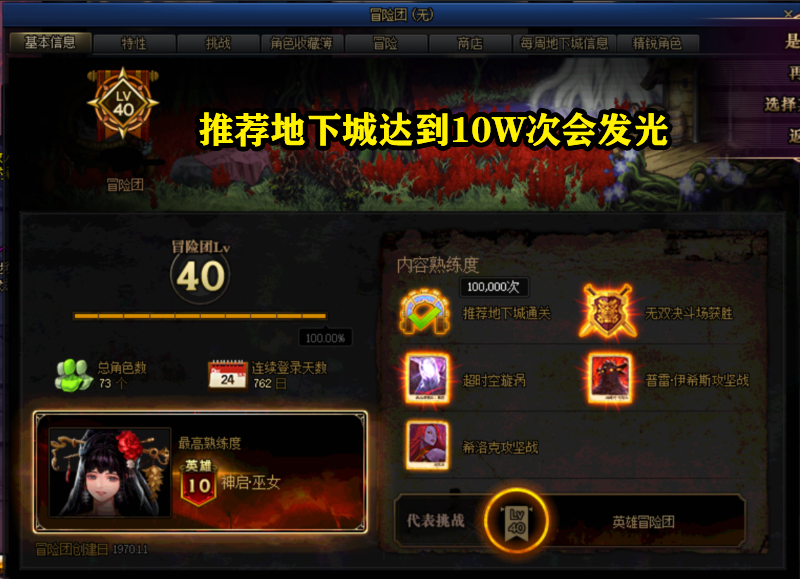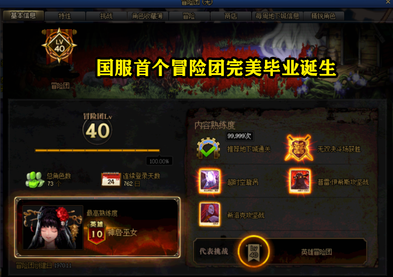 其次,我们在冒险团还能看到很多亮点,例如总角色达到了上限73个,角色最高熟练度为英雄10级,连续登陆天数达到了762天,熟推荐地下城高达99999次等等,最关键的是这位玩家的创建日还是1970.1.1,这里有必要解释一下创建日期,只有2008年6月19日公测之前激活的玩家才会出现这个日期,可以算是DNF最老一批的元老级玩家了。