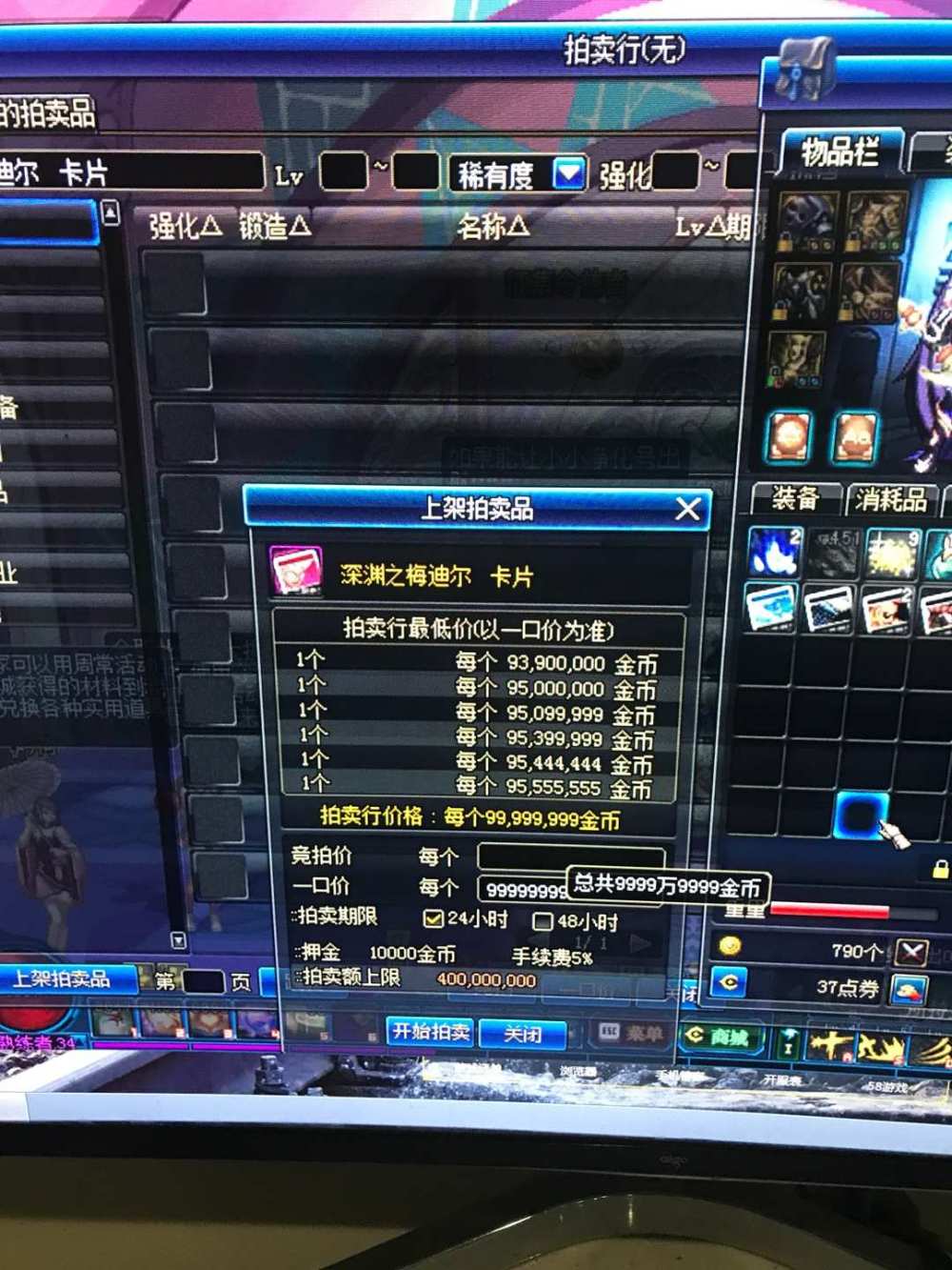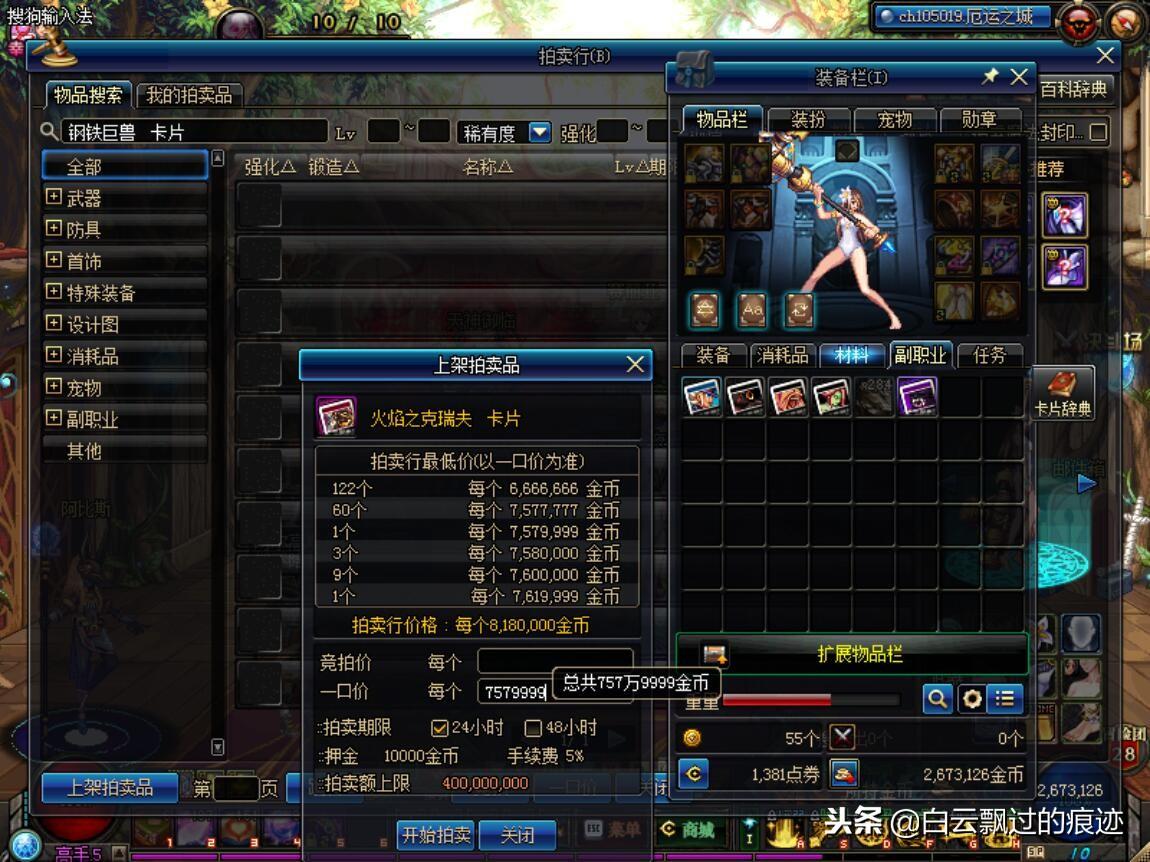 再次看到这张卡片,我不由得打开了拍卖行,把仓库里的卡片试着上架拍卖,惊奇的发现这张火属强卡片这么贵,就多了一个+10的独立攻击,竟然能卖到七百多万一张,会有人买走吗,很好奇!不管了,把仍在仓库快发霉的的卡片果断扔上拍卖行,获得小小的收入也是很美好!