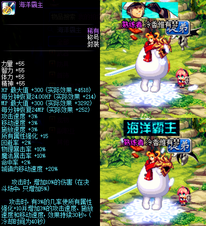 16年国庆套称号是骑士王的荣耀,属性方面和17年的海洋霸主几乎是一模一样的,但是骑士王的荣耀现在在拍卖行的价格要比海洋霸主高200万左右。可能是因为骑士王的荣耀是神器级别称号,并且库存方面更少了。