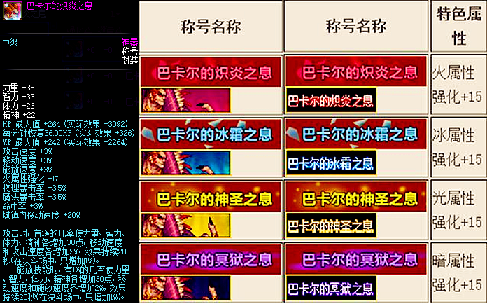 13年的国庆套称号是巴卡尔系列,有炽焰、冰霜、神圣和冥狱四种类型选择,分别代表火、冰、光和暗四种属性强化。这款称号是DNF史上首款最高强属性的称号,价格在当年可是不菲的。