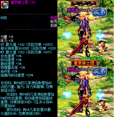 12年国庆套称号是皇家骑士团,这款称号的属性在当时属于中庸水平,但是在决斗场中却有奇效。是继第一套夏日套海之勇者乌龟称号后的又一款超强回血称号,在决斗场中被攻击时1%的几率恢复10%HP,相当之无赖的存在。