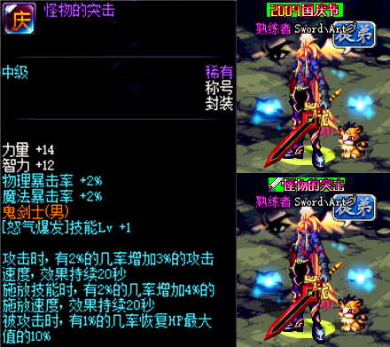 09年的国庆套称号是怪物的突击,属性方面的加成非常之少,唯一的亮点是Lv30级技能+1。在当时什么都缺的版本,这个称号可以说得上是不错的了,而且那时候还没有买礼包送称号的说法。怪物的突击是国庆套的第一次赠送称号,08年的飞天逐日国庆套是没有称号的,因此10套国庆套礼包只有9个称号。