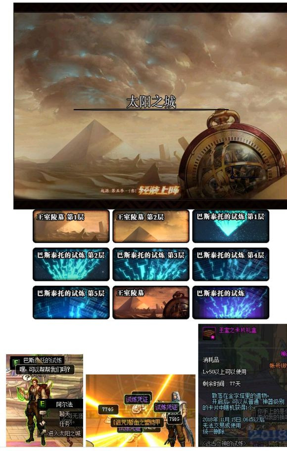 活动期间大家可进入国庆专属副本"太阳之城",通关地图之后会掉落试炼凭证,可在国庆专属NPC处兑换物品奖励。通关对应的试炼地图还会直接掉落85级的诅咒史诗装备。