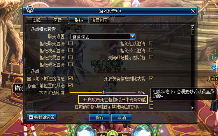 我们如果需要设置尸体清除功能,那么要在游戏中将这个功能打开,但是我们将鼠标移动到功能上会有说明,组队的时候必须全部队员开启这个功能才能有效,这就是为什么大家说组队的时候没有效果的原因了,只要有一个玩家没有打开,那么就不会清除。