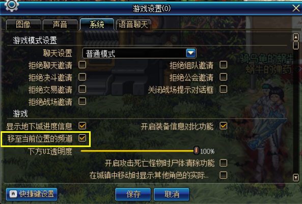 我们再菜单栏中找到设置,点击设置菜单中的系统设置,然后我们看到在游戏设置中有一个【移至单签位置的频道】,我们只需要将这个设置功能打上勾,那么我们就正常开启了原地切换频道的功能,这个设置对很多时候频繁切换频道的玩家来说非常的实用。