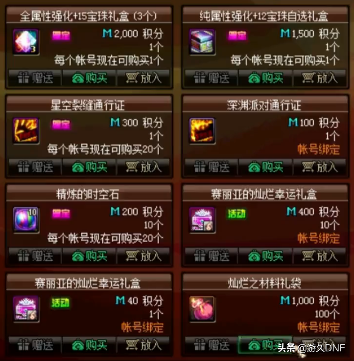 今年的积分商城中设置的最好道具是属强宝珠,分别是全属强强化+15的宝珠3个,另一个是纯属强(应该就是单属强)+12的自选宝珠!这个宝珠不能说不好,但是绝对是算不上最好,所以只能说得上是不错,而真正最好的道具,其实是下面那个不起眼的灿烂材料礼袋!