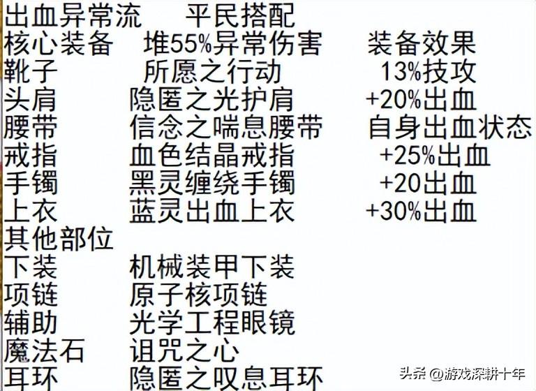 然后再说2种主流搭配,一种是纯伤害出装,也不算红眼哥独有,基本上所有输出职业都可以照搬;另一种是出血流搭配,异常套装中的一种,大家还可以根据职业选择中毒、灼伤、感电等。