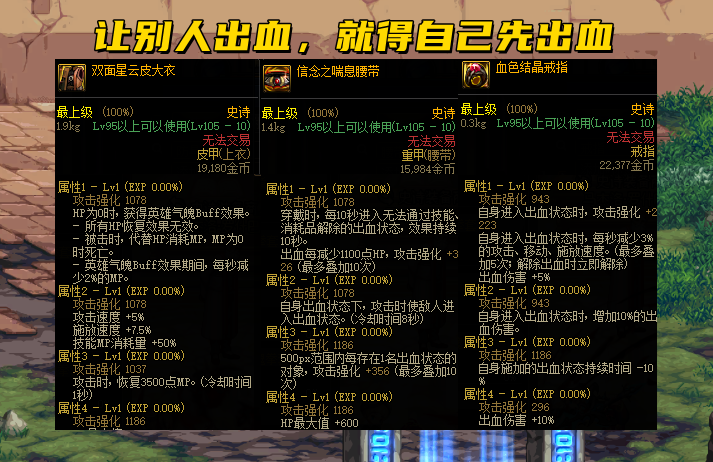 【出血流搭配】:防具推荐“连击头肩+星云皮大衣/逆转结局+时装裤子+信念腰带+天才鞋子”;首饰推荐“出血手镯+金币项链+血色结晶戒指”;特殊推荐“死亡之冠+诅咒的枷锁+宠物右槽”。