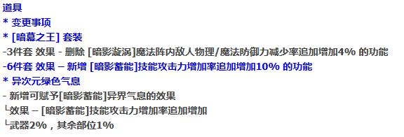 随着之后将要来到的职业改版和异界改版,可以看到,新增了暗幕之王6件套对暗影蓄能的提升,同时散件的绿气息也有了对BUFF技能的额外增加,武器为2%,其余部位1%。这也就意味着完美换装需求的改变。