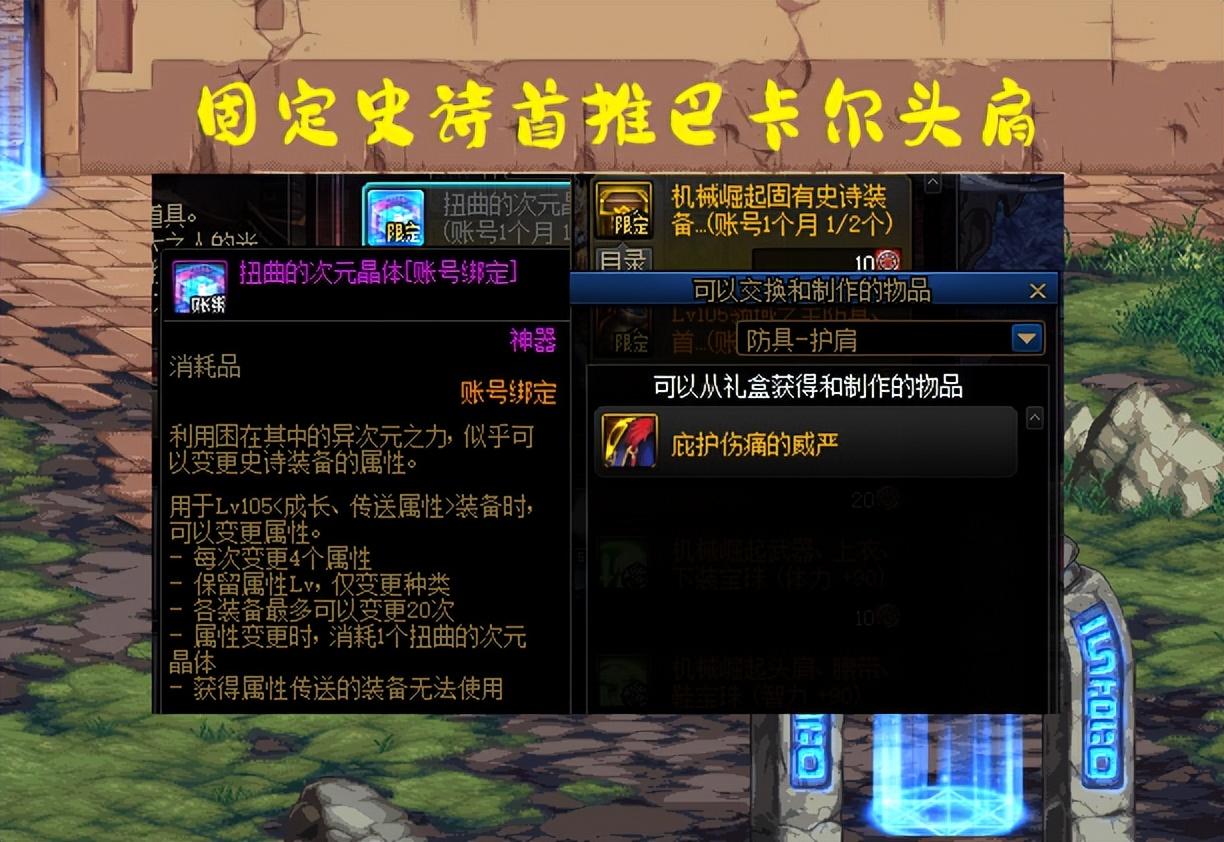 “自选固定史诗”,巴卡尔固定史诗推荐4个部位,“头肩”非常强且百搭,每月最多可换2件巴卡尔头肩;“鞋子”石化鞋、适合没有攻速的玩家;“手镯”最强的直伤手镯,“耳环”自异常耳环,随机赋予一种异常属性。