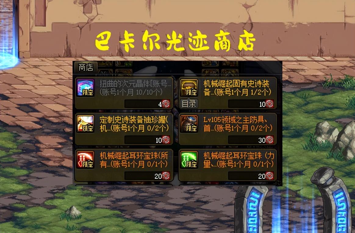 然后再来看巴卡尔/巴卡妮的【光迹商店】,当月限定道具有:10个次元晶体(4个)、2个自选固定史诗(10个)、2个自定义史诗罐子(10个)、2个自定义传说罐子(30个)、11属强耳环宝珠(20个)、175四维耳环宝珠(20个)。