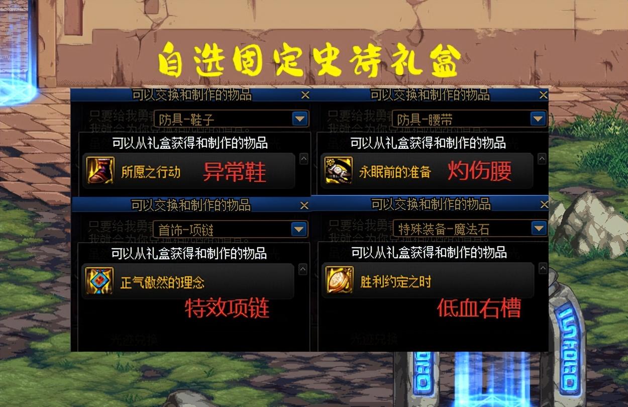 “自选固定史诗” ,需要10个军团材料兑换,军团本的固定史诗有几个推荐对象:“项链”主打特效流,大天御玩家必换;“魔法石”主打低血增伤,走低血流的玩家可以考虑;