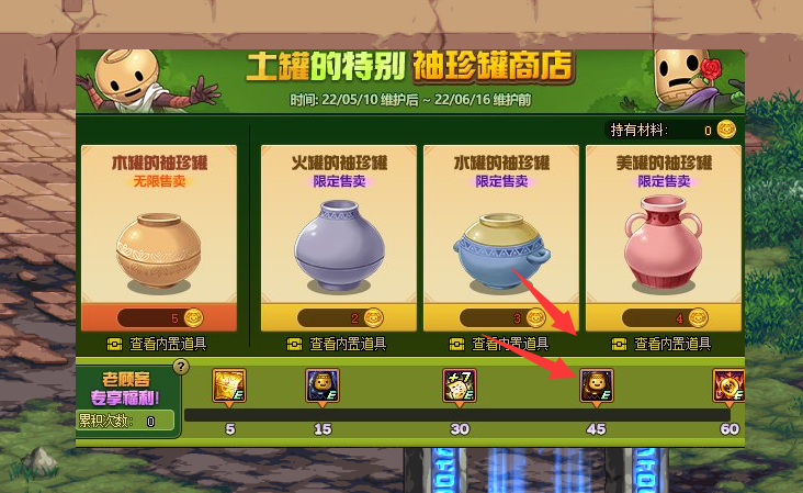 拿到硬币之后,就可以去开罐子了,总共有木罐、火罐、水罐、美罐4种类型,开启所需金币也有所不同,当累计开启45次以后,就可以领取罐子头装扮了,此装扮为永久可佩戴时装,这点还是值得认可的。