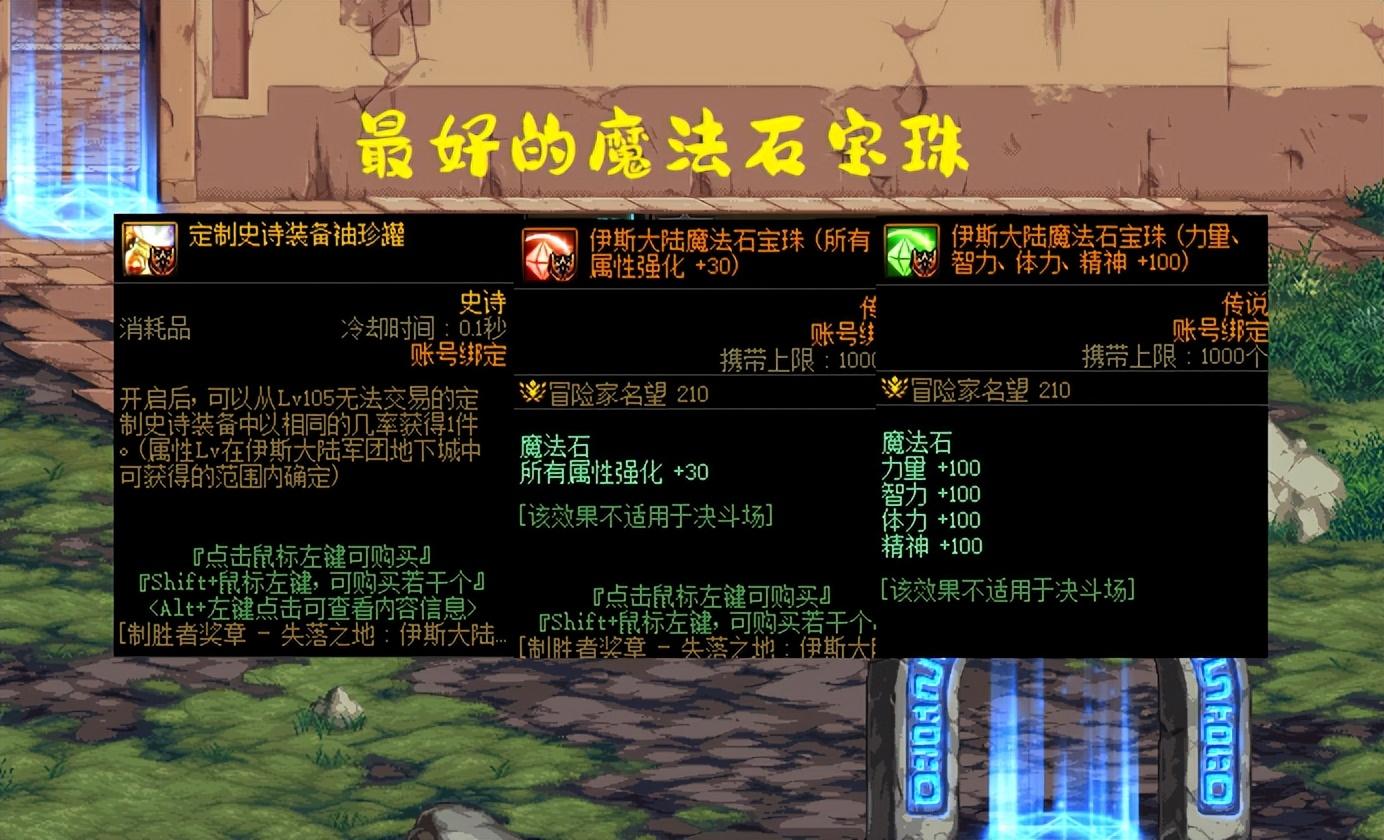 首先是2颗“魔法石宝珠” ,30属强和100四维,分别对应输出职业和辅助职业,这2颗宝珠就是目前为止最好的魔法石附魔,意味着所有玩家所有职业都应该更换,而且还不花钱,所以大家懂了吗?如果还没换的话,赶紧给自己职业来一个。