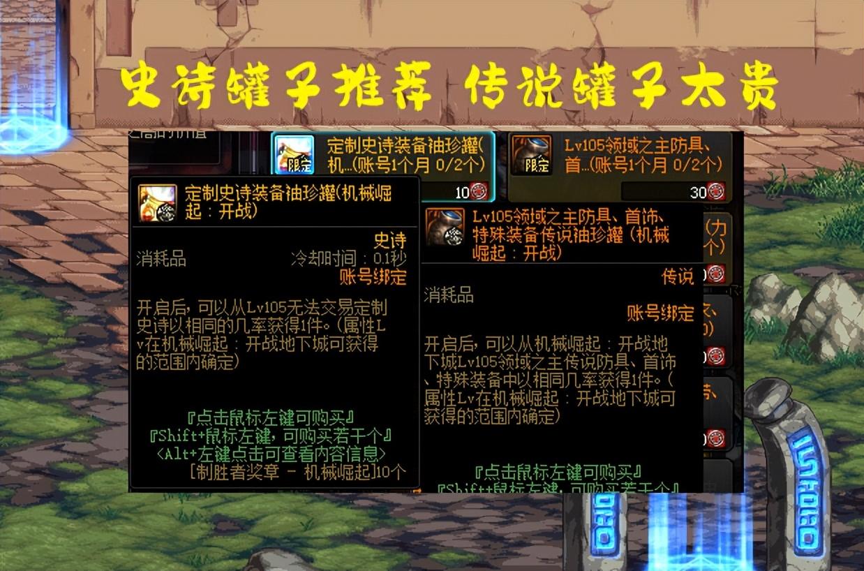 “自定义传说罐子” ,30个材料兑换,为什么传说罐子比史诗罐子贵呢?因为开出来的传说装备可以交易,随便一件上衣就是大几百万价格,也算一种摸金操作了,运气好开出30%出血或低血8%技攻,那就是几千万价格了。