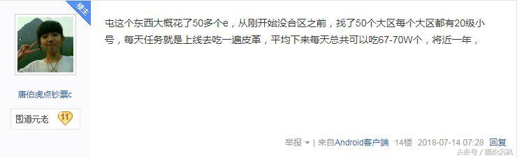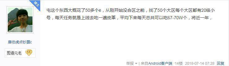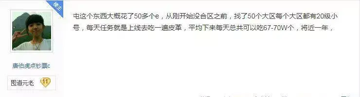 据这位神人披露,他屯破旧的皮革大概花了50多个e,从刚开始没合区之前就开始吃,一共吃了50个大区,每天的任务就是上线去吃一遍皮革,平均下来每天总共可以吃将近70w个,日复一日竟然吃了1年之久!