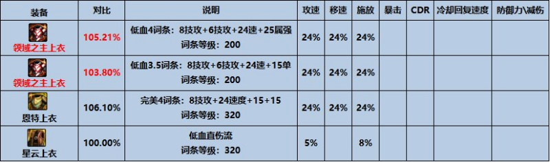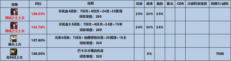 传说护肩的强度主要来自于手搓12技攻、消耗品强化、20速度等词条,其中20速度可更好叠加攻速鞋140攻速限制,消耗品强化能够在实战吃多药情况进一步加强,而手搓技攻在全手搓情况下拥有较高上限。另外,护肩还存在着其他优秀词条,比如非无色小技能15技攻,削韧,连击40属强,30、40、45级技能特化加成等等。③领域之主下装(4词条均为50级,词条总和200)