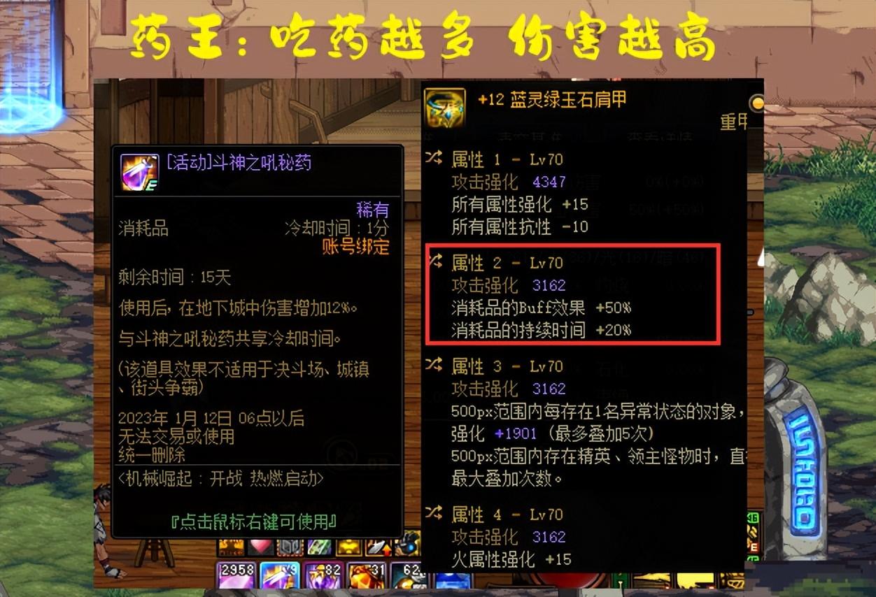 从这里得出的结论是,如果一个药都不吃,那么即便是最完美的药王头肩,实际强度也比较低,甚至都不如自由之翼,所以药王头肩就必须建立在吃药前提上,这是硬核要求;