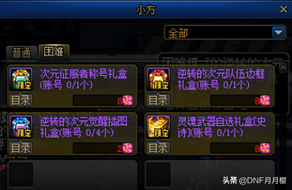 破碎的记忆碎片 :每周可以获得120个。周奖励有逆转的次元魂灭结晶礼盒(300个)、一次性继承装置、一次性材质转换器以及三种灵魂武器礼盒。账号奖励有逆转的次元最高天神器装备自选礼盒、林纳斯的神器模具礼盒以及三种逆转的次元宝珠。