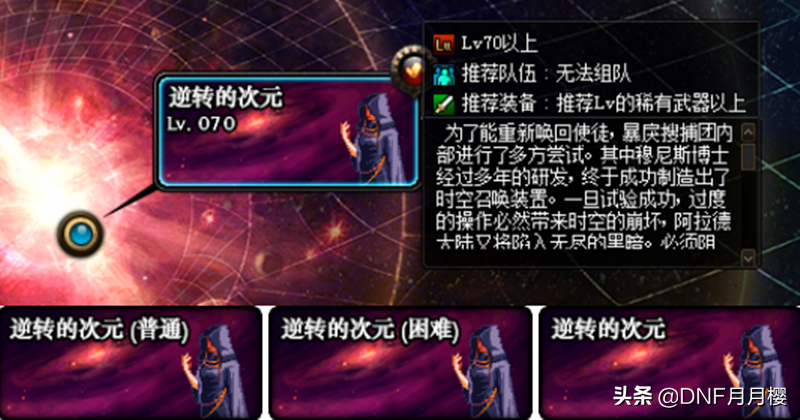 逆转的次元活动,5月21日开启,6月18日结束。在活动期间内,我们只要在赛丽亚房间找到NPC小方,与之交谈完成任务,就可以进入"逆转的次元"副本了。目前,逆转的次元分为普通与困难难度,每个账号每周可进入3次,普通/困难难度共享次数。当我们进入地下城之后,就会随机进入一个当初的异界副本。值得一提的是,普通难度与困难难度的异界副本有些许不同。
