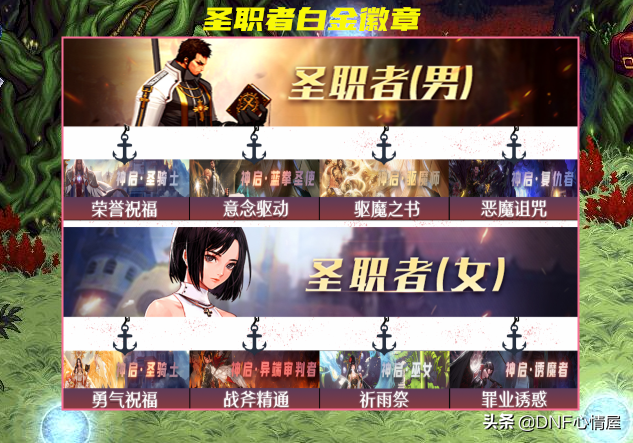 其实对于圣职者系列职业,白金徽章方面上,奶爸和奶妈十分出名,五一洗称号主力军。但偏稀有的,就不是太了解,比如蓝拳“意念驱动”,复仇者“恶魔诅咒”,巫女“祈雨祭”,诱魔者“罪业诱惑”等。