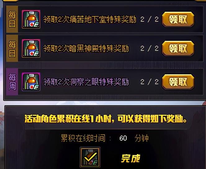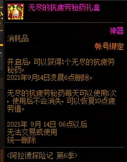 阿拉德探险记(每日10pl):当开启高级探险家且升至50级后,可领取“无尽的抗疲劳秘药”,其效果为每日可使用一次恢复10pl。