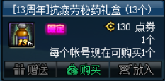 商城-活动-DNF13周年(1x13pl):于活动期间内,小伙伴们可通过此处花费130点券(1.3元)购买13个1点pl药,合理利用可多刷13次巨龙/深渊等副本。