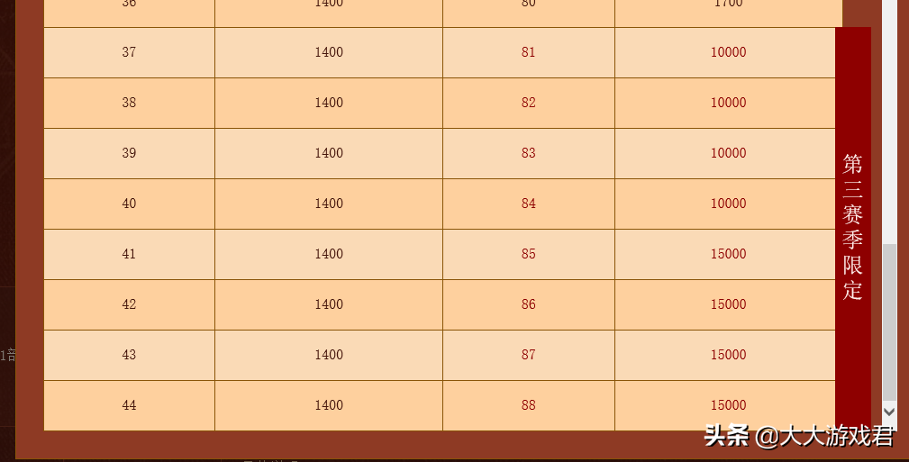 当然除了奖励更为丰厚之外,升级模式也与之前的战令不同,前两季的战令满级均是80级,且每一级所需要的经验都是相同的。而现在的第三季战令的等级经验前80级呈现一个缓慢递增,到了80级之后是一个爆炸性的增加,81级到84级每级都需要10000经验,而84-88则每级需要15000的经验,要知道,前80级的每级经验可都是1000多一些啊,后面的经验需要的实在是太多了。