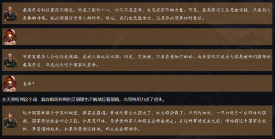 在故事薄“天界的清风”中我们可以看到,艾丽婕听从了杰克特的意见,“不要成为贵族操控的木偶”,从而选择当上皇女(原本是最高祭司)。