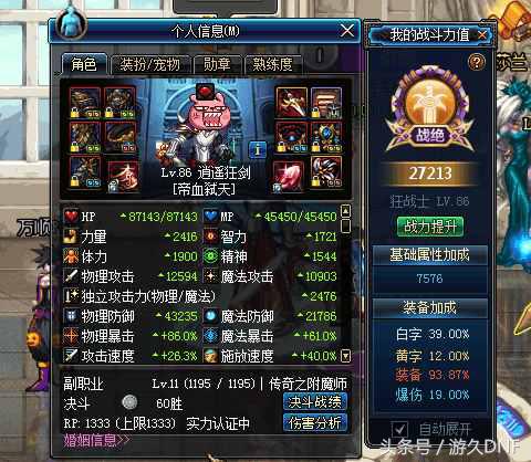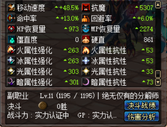 测试的对象一样还是上一期的红眼,把海博伦卸下来后的面板比较低,2694点力量,2403点独立,193点暗属性强化,白字附加49%,追加暴击37%,追加黄字35%,最终伤害55%。以上属性,白字,追加伤害和最终伤害都会稀释,那么稀释的属性大家根据自己身上的进行计算,大多数的稀释属性可以这样计算比如你本身的最终伤害为Y,那么装备最终伤害为X,那么提升量的计算公式为:Y+X)/Y,技能攻击力是乘算不稀释,黄暴冲突,所以95版本的大部分史诗属性都是不冲突的追加伤害,但是会稀释。