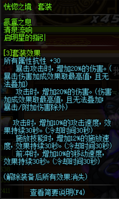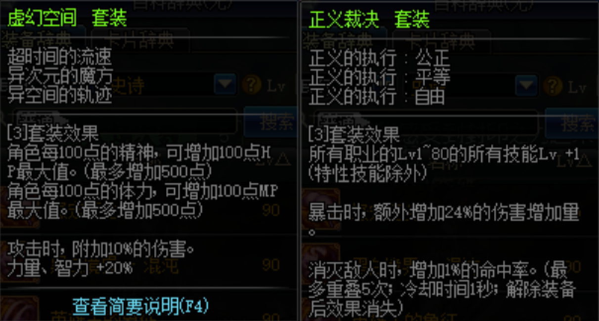 虚幻空间套装属性增加10%的白字附加,提升量为6.71%,20%的力智提升量为20%,综合提升量为28.05%;正义裁决套装增加24%的追加爆伤17.52%,但是还有1-80级的技能等级提升,提升量约为7%左右(技能加成看职业,所以我们只能大概的定一个平均数值)综合提升量为25%左右。