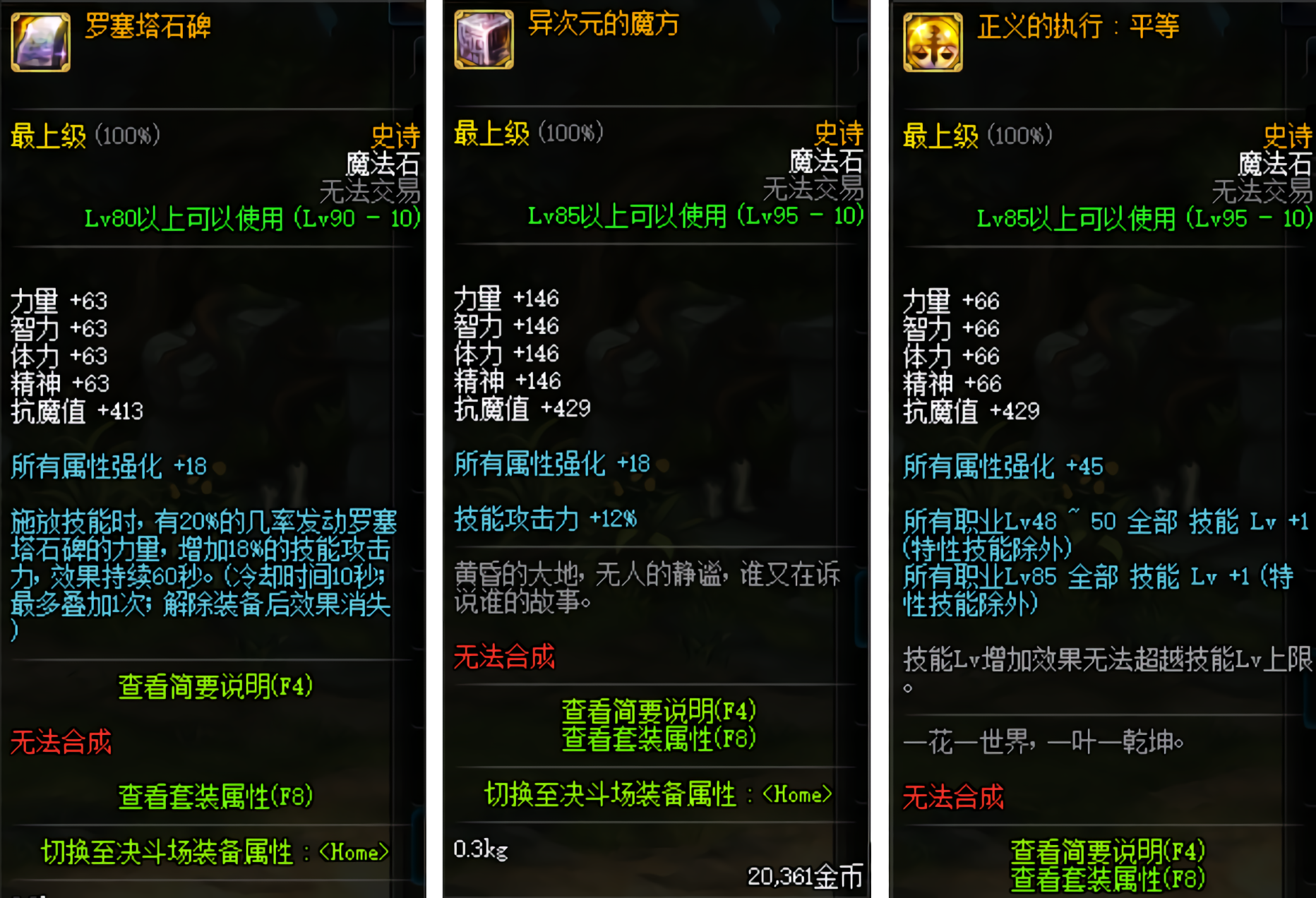 这两套特殊装备,虚幻空间看起来提升量更高一些,但是如果装备有属性白字,那么正义裁决中魔法石的45点的全属性强化加成会有更大的提升,比如95级哈林史诗皮甲就是属性白字,在选择上要根据自己的实际情况做搭配,我们只能粗略的计算提升量,但是并不代表所有玩家的装备加成是一样的。